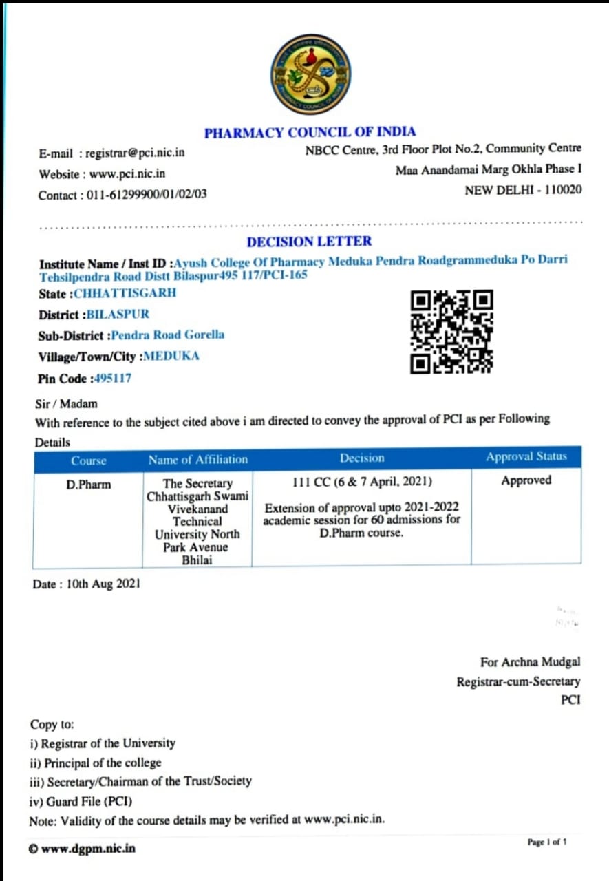 Ayush College of Pharmacy has been established in the year 2018 by Gram Meduka Krishi Shikshan Samiti, Meduka which is registered under the Chhattisgarh Society Reistration Act. The college aim is to provide quality education to the youth and to make them self efficient, self reliant and awakened citizens of India. The college is affiliated to Chhattisgarh Swami Vivekanand Technical Univarsity (CSVTU, Bhilai) and recognised by Pharmacy Council of India (PCI).